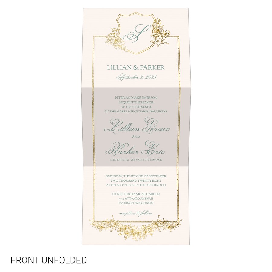 Our Floral Monogram Vertical Trifold Wedding Invitation offers an elegant, monogram design that is perfect for sharing every detail of your special day. With three panels, this folded wedding invitation unfolds to reveal your wedding information in a sleek and organized format. The front features your custom invitation text with a classic monogram and floral artwork printed in digital, gold ink.